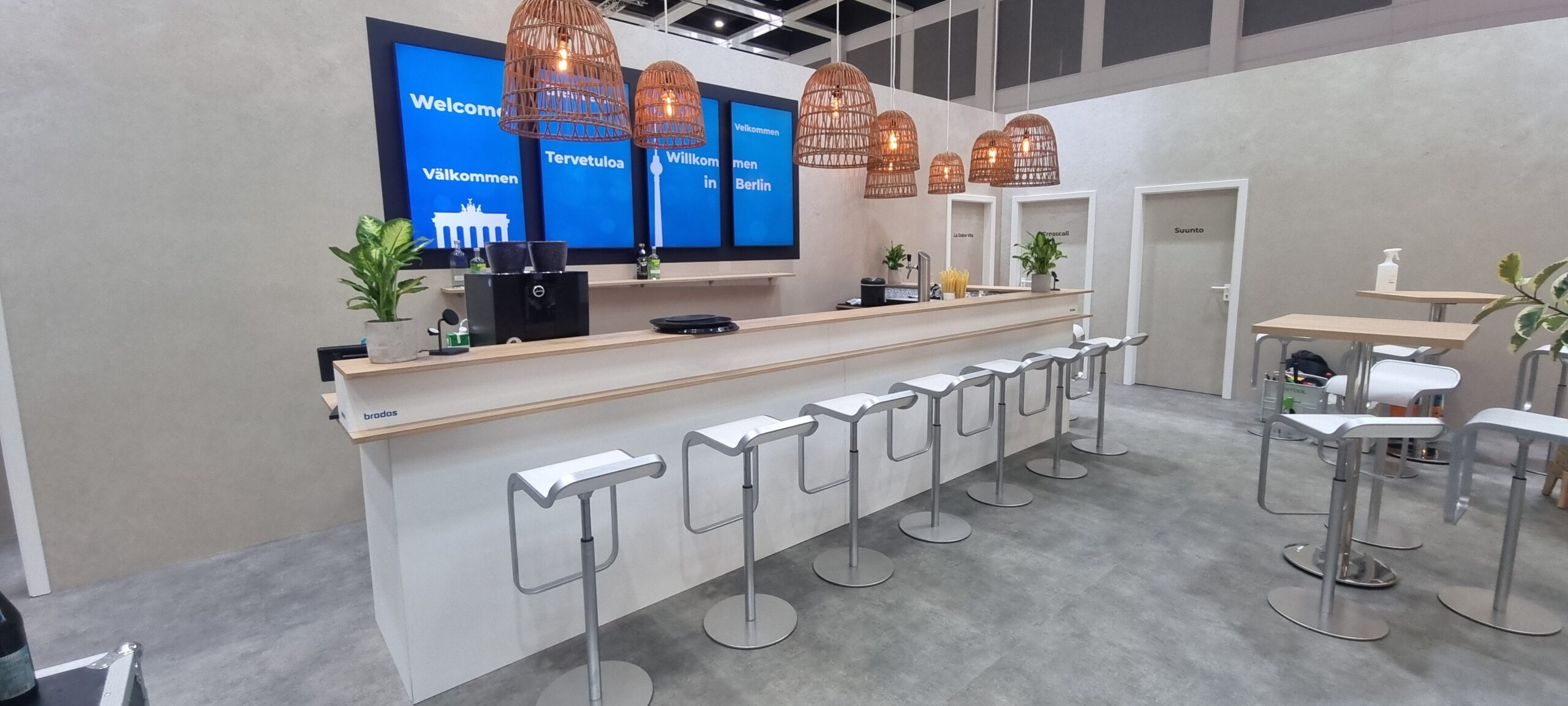 Ein großzügiger Cateringbereich bildet das Herzstück des Standes – ein Ort der Begegnung, an dem sich Besucher, Partner und Kunden austauschen können. Ergänzend sorgen abgetrennte Kabinen, die flexibel als Küche, Lagerraum oder Meetingraum genutzt werden, für eine durchdachte Organisation und reibungslose Abläufe während der Messe.