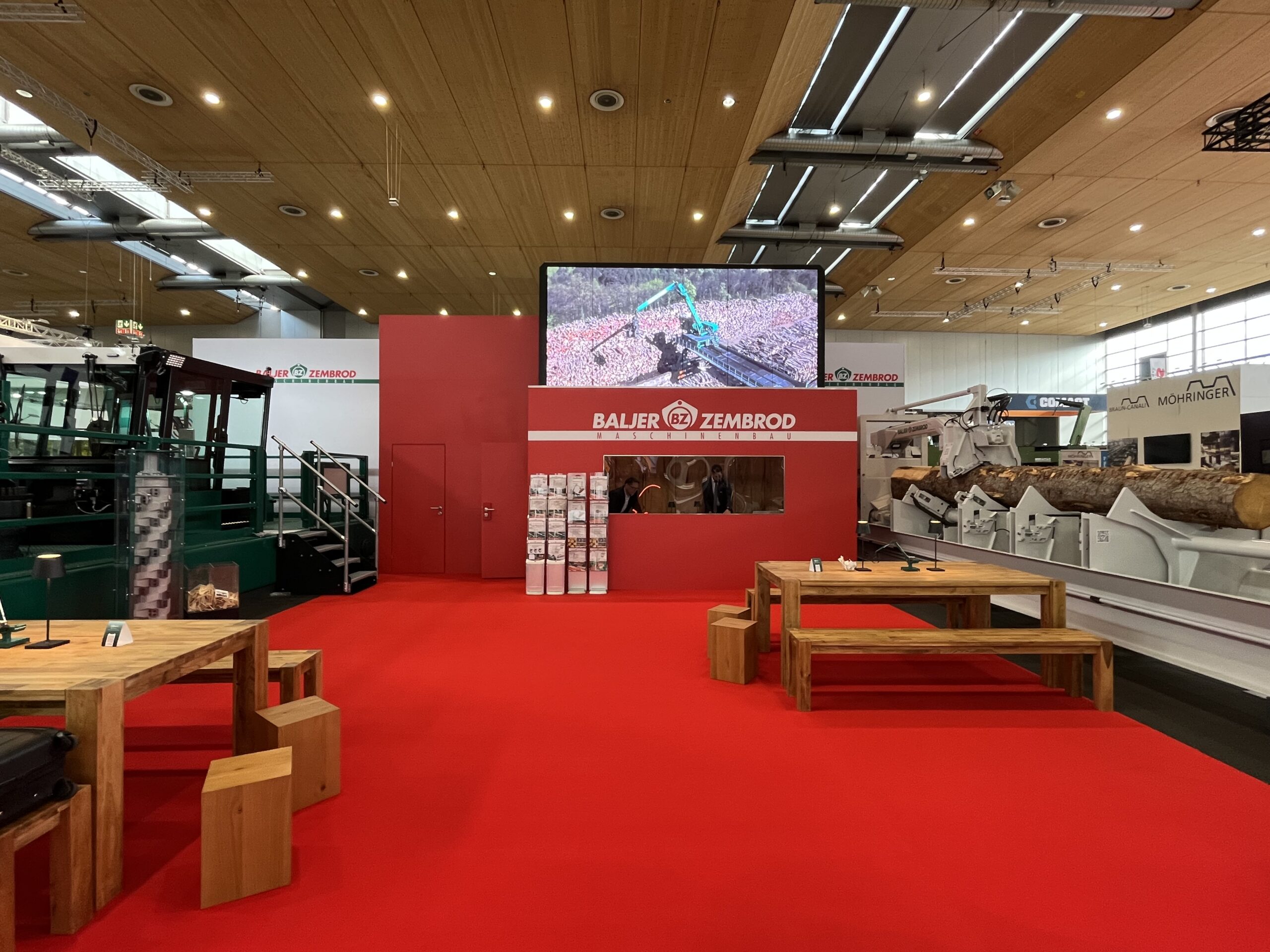 Protec Messebau realisiert für die Baljer & Zembrod GmbH & Co. KG eindrucksvolle, großflächige Messestände, bei denen die jährlich präsentierte große Maschine klar im Mittelpunkt steht. Passend zur Markenidentität setzt der Messebauer ausschließlich auf hochwertige Holzmöbel, die dem Stand eine natürliche und authentische Atmosphäre verleihen. Ein besonderes Highlight war in einem Jahr sogar ein echter Baumstamm als Standbegrenzung, der viel Aufmerksamkeit auf sich zog und die Verbundenheit zum Werkstoff Holz verstärkte.