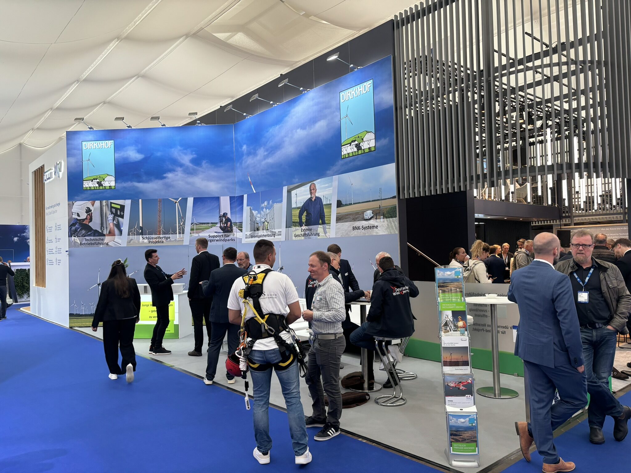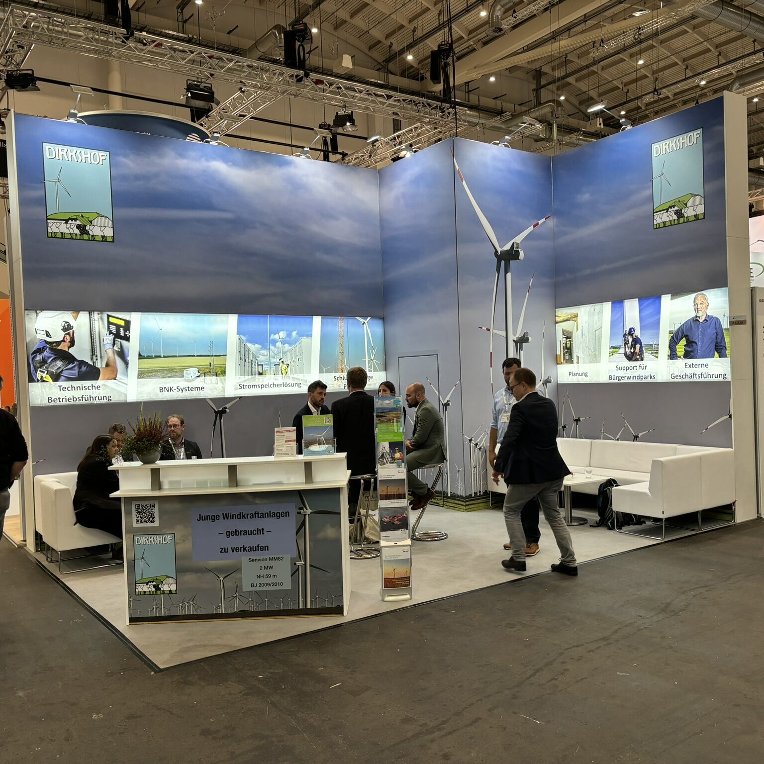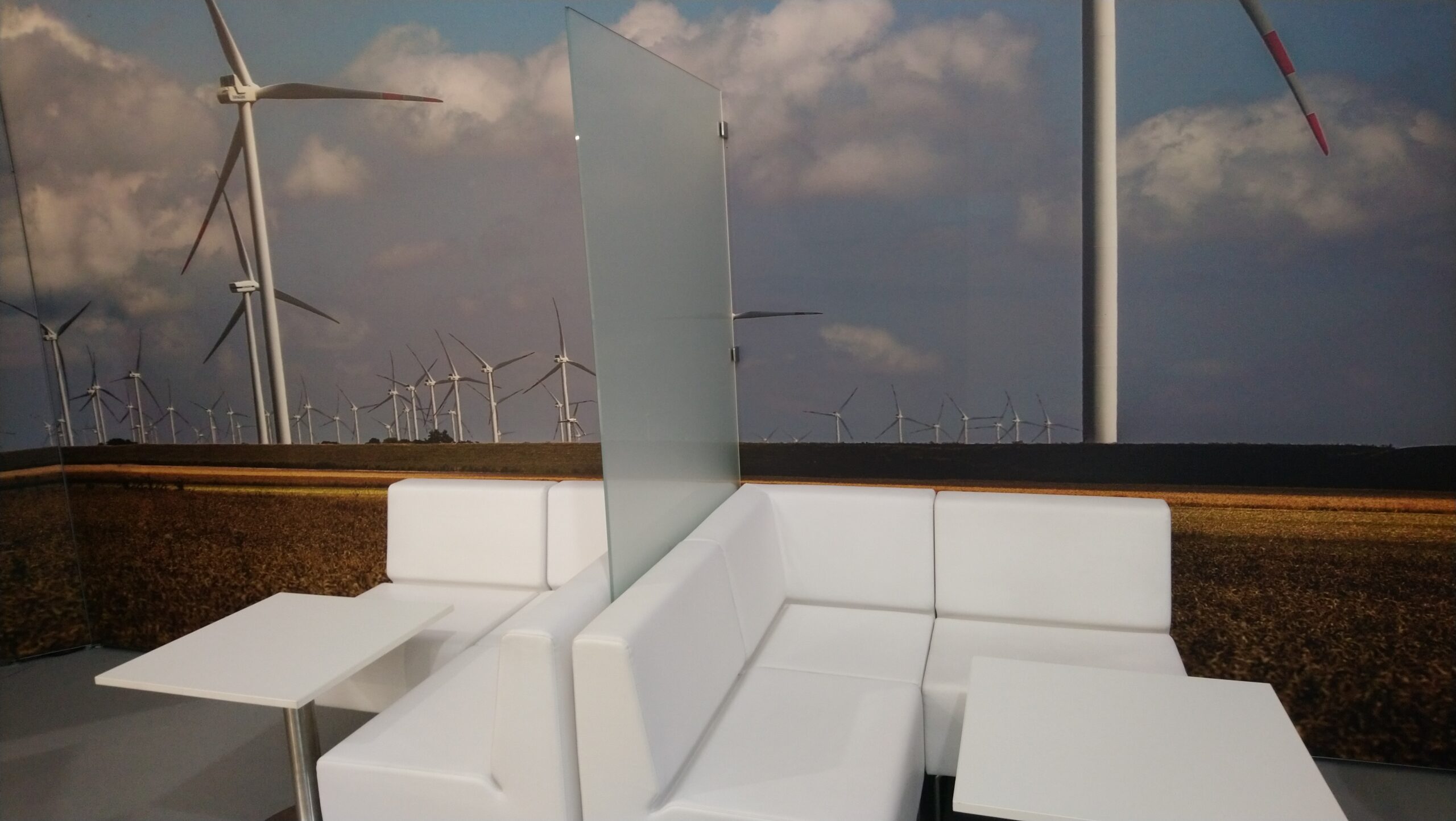 Protec Messebau zeigt beim Stand der Dirkshof EED GmbH & Co. KG auf Messen wie der Husum Wind und der WindEnergy Hamburg, wie sich selbst aus einer schmalen, langen Fläche ein überzeugender und funktionaler Messeauftritt gestalten lässt. Eine großformatige Grafik an der Wand vermittelt das Gefühl, direkt an den Windkraft-Anlagen an der Nordsee zu stehen, und sorgt für eine helle, ansprechende und einladende Atmosphäre.