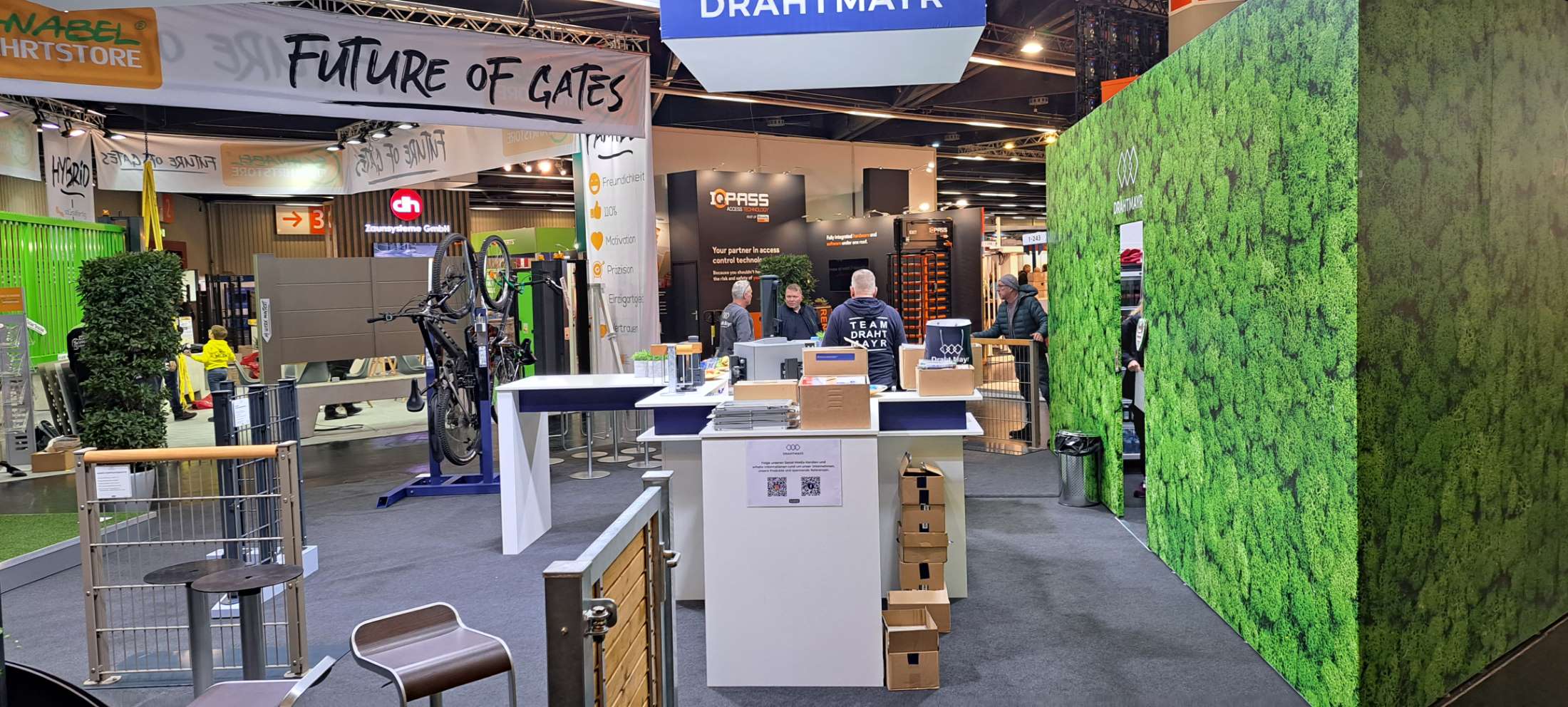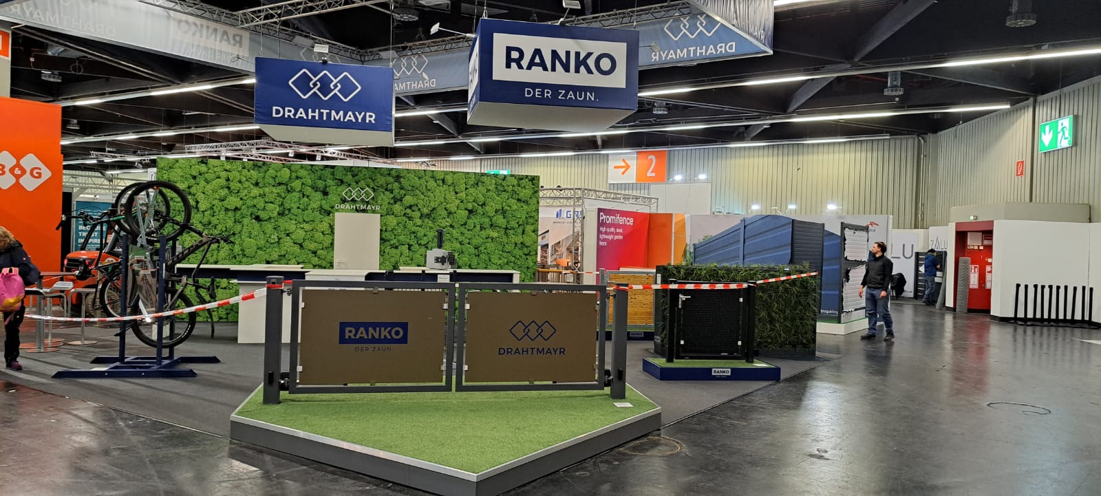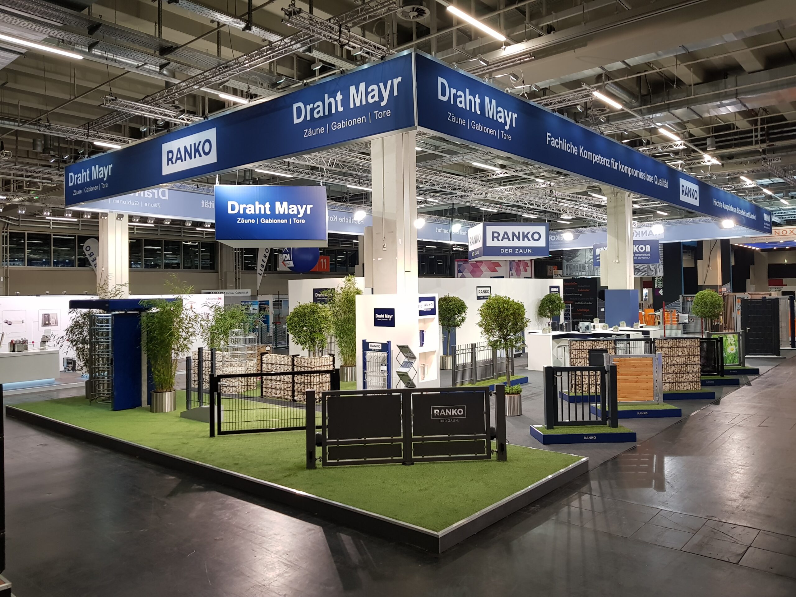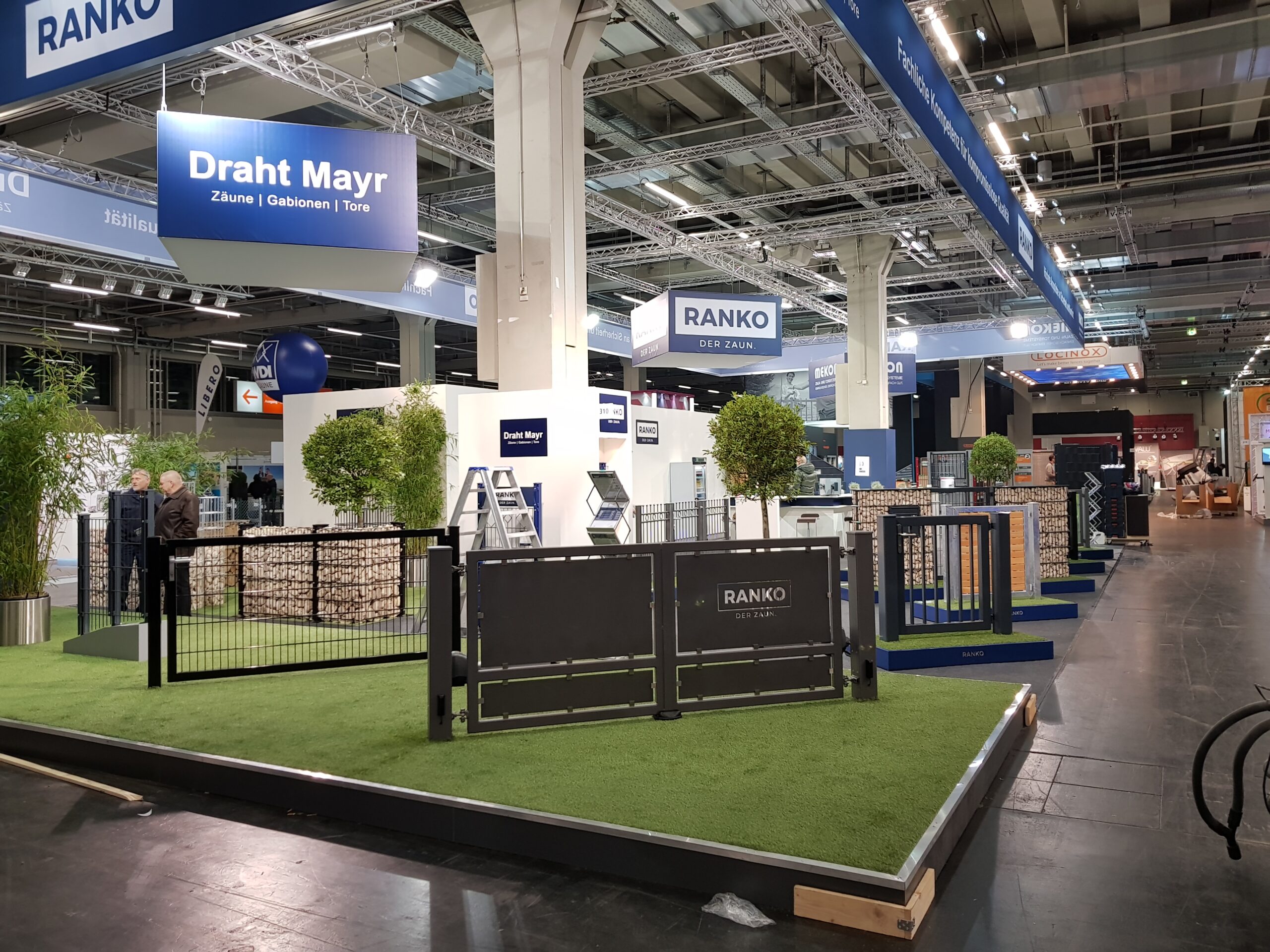 Für die Draht Mayr GmbH realisiert Protec Messebau auf Messen wie der Perimeter Protection großzügige Messestände mit über 100 qm Fläche, die optimal genutzt werden, um die vielfältigen Zaun-Exponate eindrucksvoll zu präsentieren. Bereiche für Gartenzäune werden bewusst mit Kunstrasen statt Teppich ausgelegt, um eine authentische und natürliche Umgebung zu schaffen.
