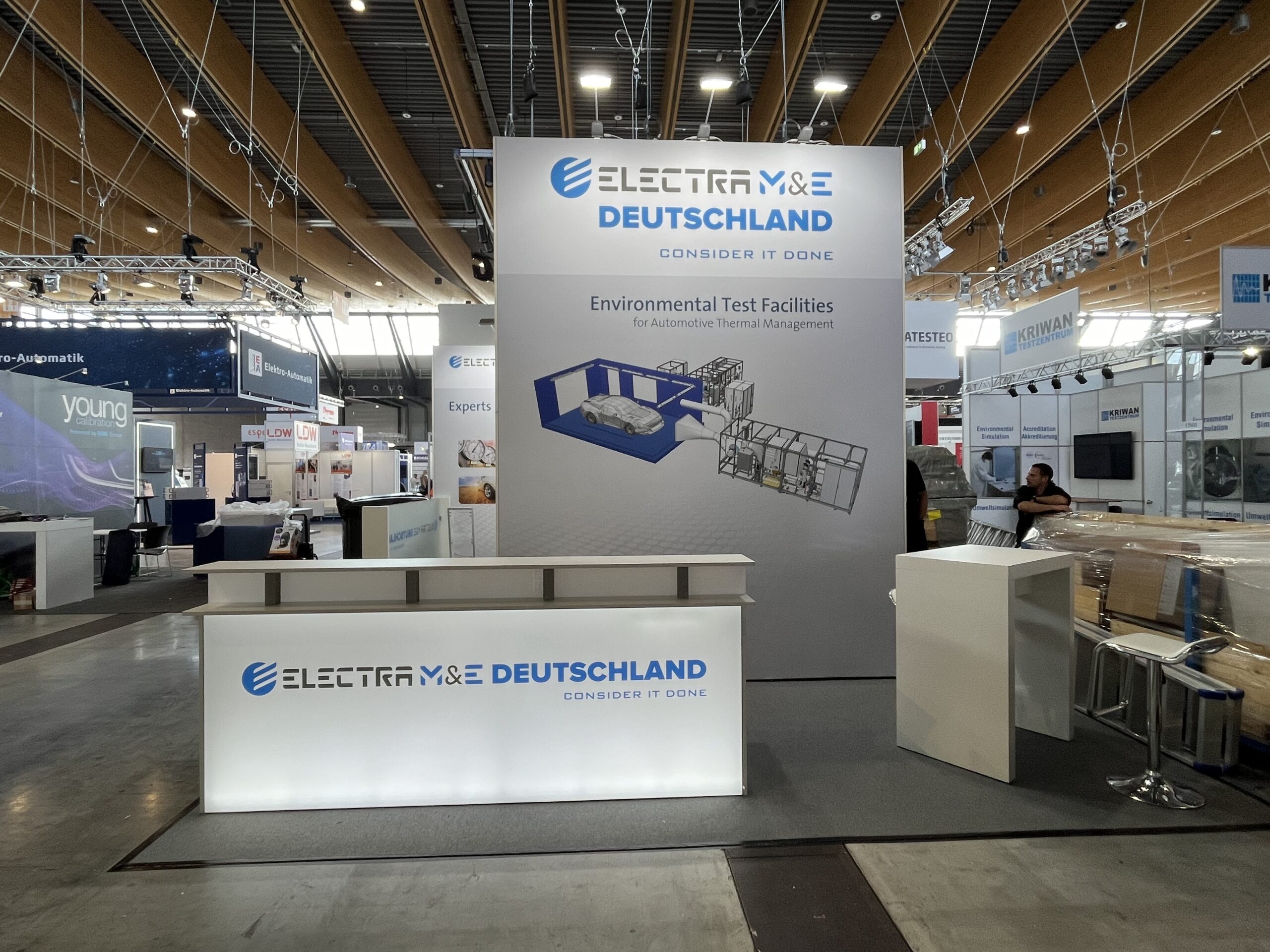 Die Wände präsentieren übersichtlich die verschiedenen Unternehmensbereiche, und Logos sowie der Unternehmensslogan auf Tresen und Glastrennwand sorgen für einen starken, professionellen Markenauftritt. So entsteht ein kompakter, aber überzeugender Messestand mit maximaler Wirkung.