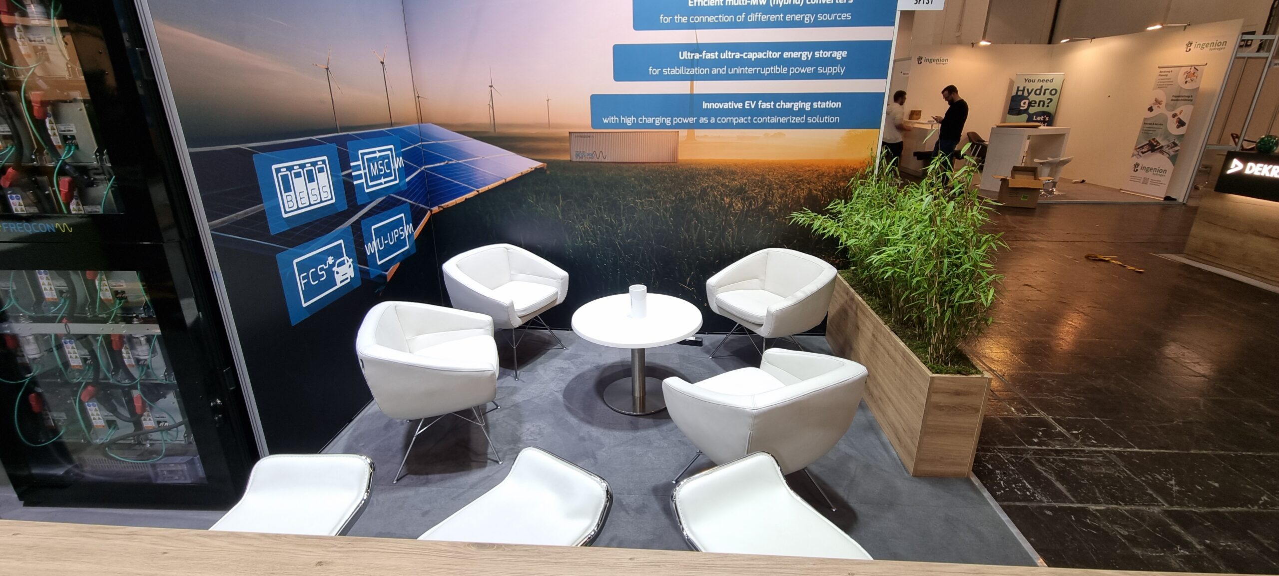 Große technische Exponate wie Batteriesysteme oder Umrichter werden offen in den Stand integriert, sodass Besucher die Hardware aus nächster Nähe erleben können. Ergänzend dazu schaffen flexibel gestaltete Meeting-Zonen mit Stehtischen und Theken ideale Voraussetzungen für Fachgespräche direkt am Produkt. Großflächiges Branding, helle Beleuchtung und modulare Standelemente sorgen für maximale Sichtbarkeit und eine professionelle, einladende Atmosphäre.
