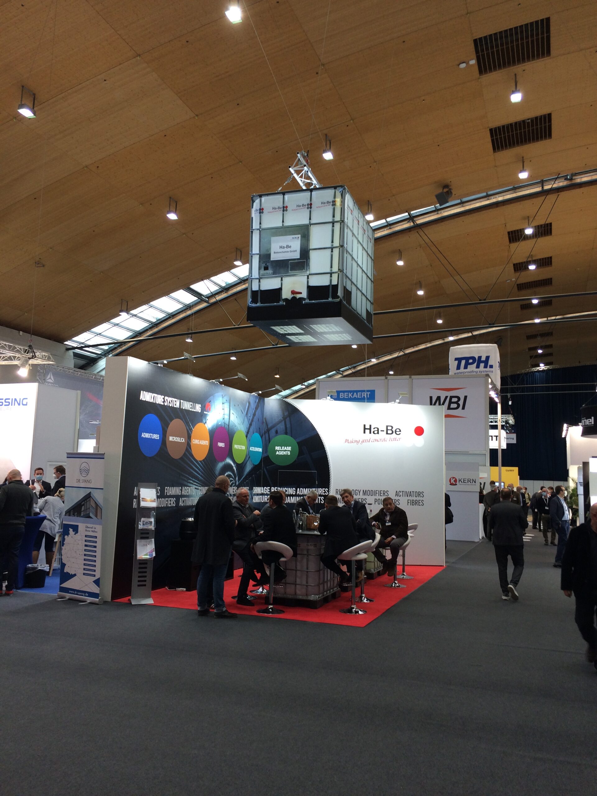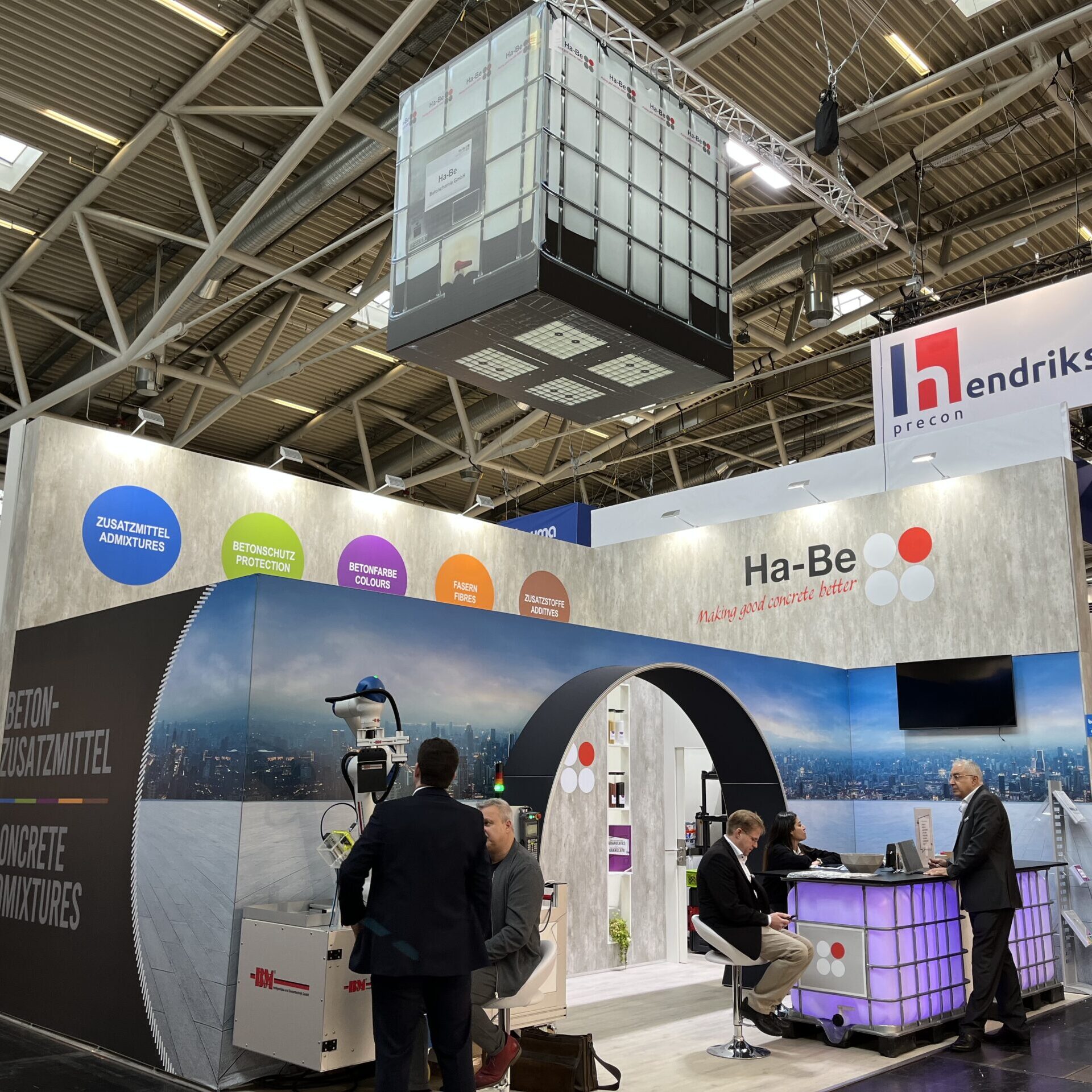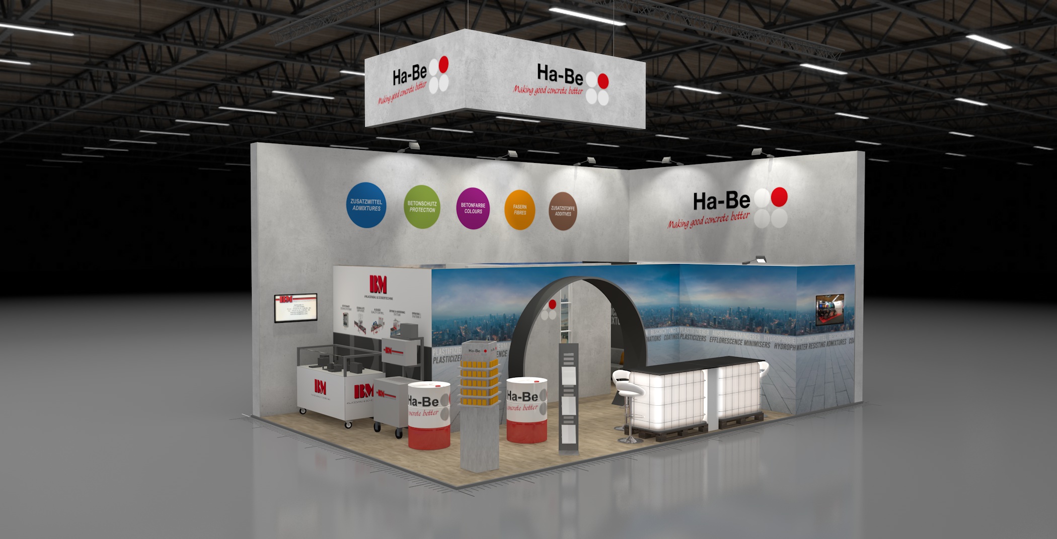 Für die Ha-Be Betonchemie GmbH entwickelte Protec Messebau ein aufmerksamkeitsstarkes Standkonzept, das Funktionalität und Markenästhetik perfekt verbindet. Ein besonderes Highlight waren IBC-Container und Fässer, die kreativ zu Stehtischen und Tresen umgestaltet wurden und so den industriellen Charakter der Marke authentisch widerspiegelten.