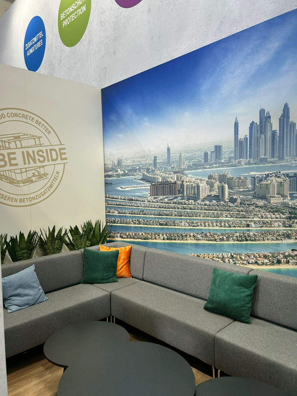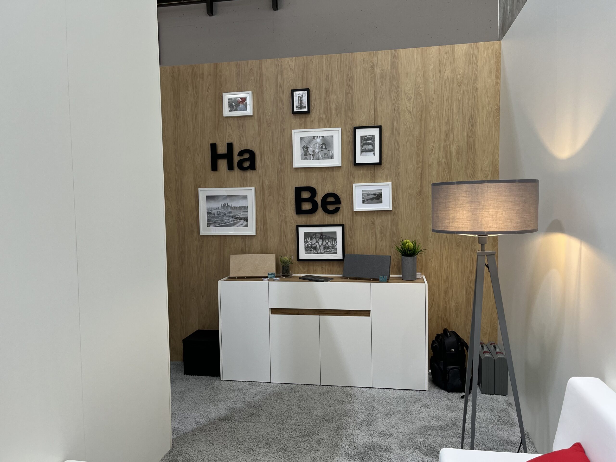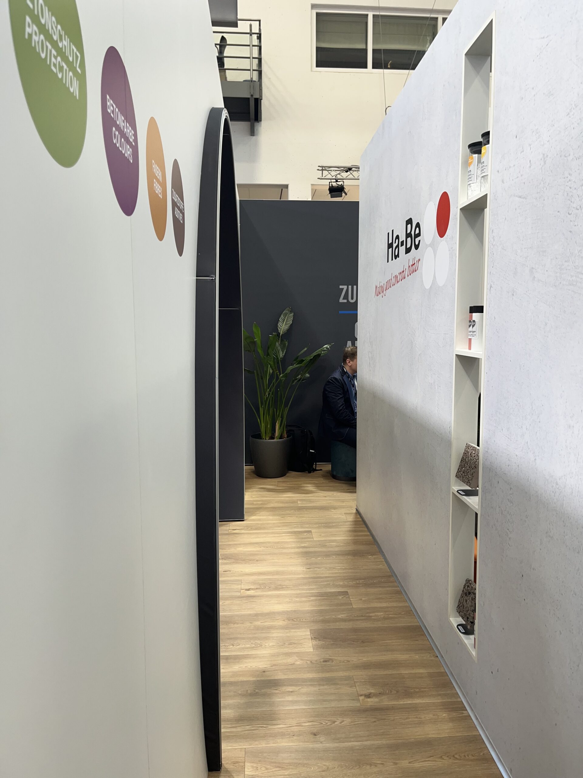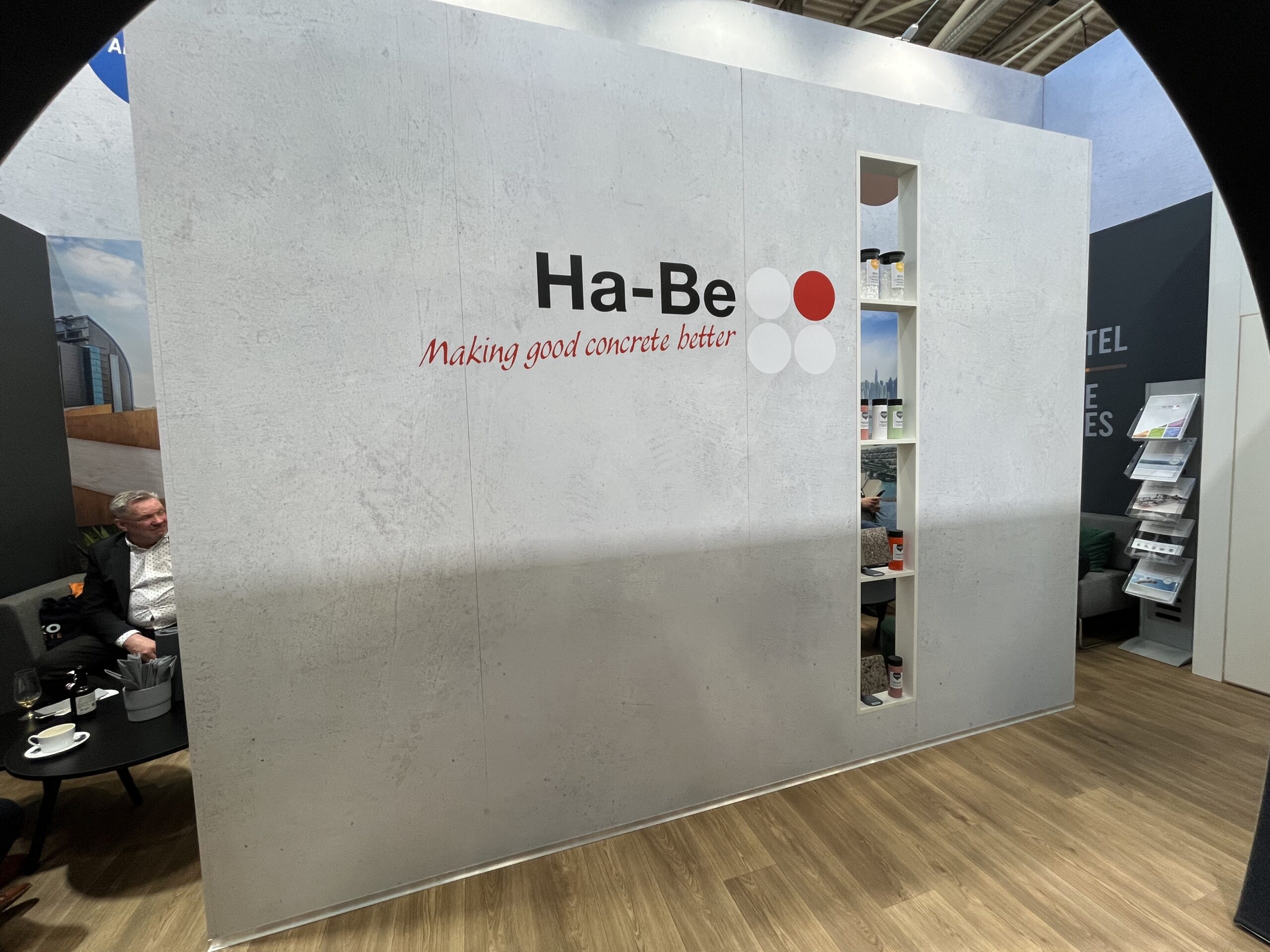Viele liebevoll integrierte Details steigerten zusätzlich die Wertigkeit des Standes – darunter in die Wände eingelassene Regale, die kleine Exponate optimal zur Geltung brachten. So entstand ein hochwertiger, durchdachter Messeauftritt, der die Botschaft der Ha-Be Betonchemie GmbH wirkungsvoll transportierte.