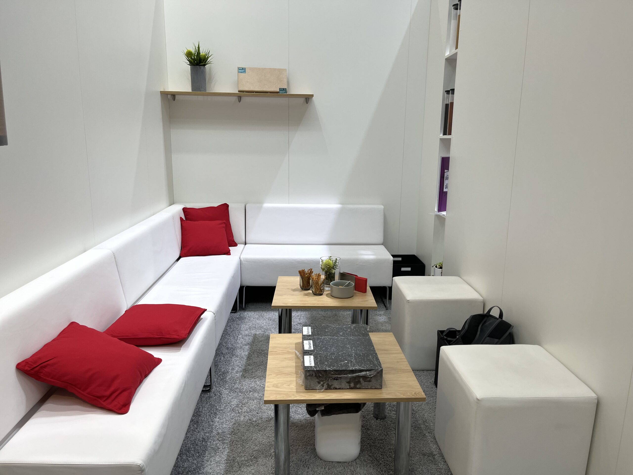 Bei größeren Messeständen setzte Protec Messebau auf eine klare Besucherführung: Im vorderen Bereich wurden Gäste empfangen und Produkte präsentiert, während im hinteren Kabinenbereich ein abgetrennter Loungebereich untergebracht war, der durch einen markanten Bogen betreten wurde. Dieser Aufbau schuf sowohl Offenheit als auch Rückzugsmöglichkeiten für Beratungsgespräche.